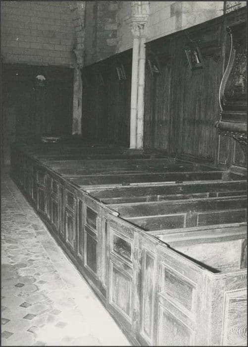 A droite de la nef, quatorze bancs clos et seize à gauche de la nef. Boiseries à panneaux moulurés.