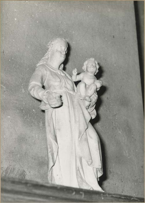La statuette de la Vierge à l'Enfant est recouverte d'un badigeon gris. Il y aurait des restes de polychromie.