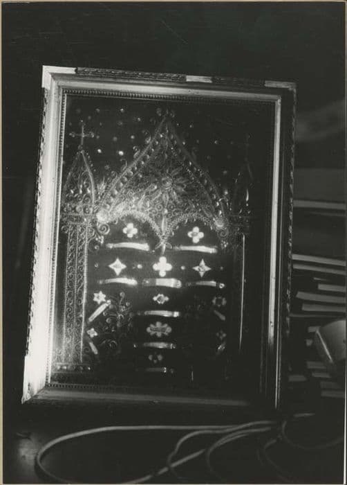 Reliquaire en papier roulé sur fond sombre (noir ?) présenté dans un cadre en bois doré.