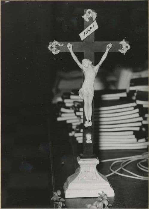 Crucifix composé d'une croix en bois, d'un piédestal, d'un Christ, et de décors en faïence blanche ; sous les pieds du Christ, tête de mort et aux extrémités de la croix des volutes décoratives.