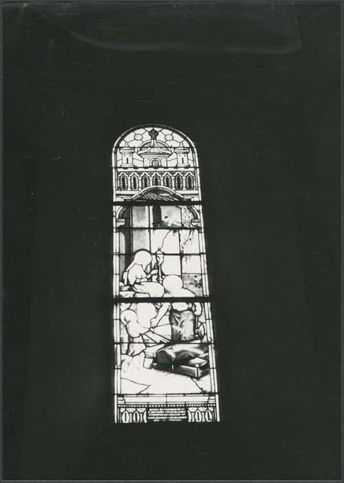 La baie se compose d'une lancette accueillant une scène historiée encadrée d'un décor architecturé de type néogothique. La verrière se compose de trois panneaux. Des inscriptions indiquent le titre (en bandeau) et le nom des donateurs (en panneau sous un bandeau légendant la scène figurée). Un fragment de la signature originale subsiste dans la partie inférieure à coté se trouve la mention du restaurateur.