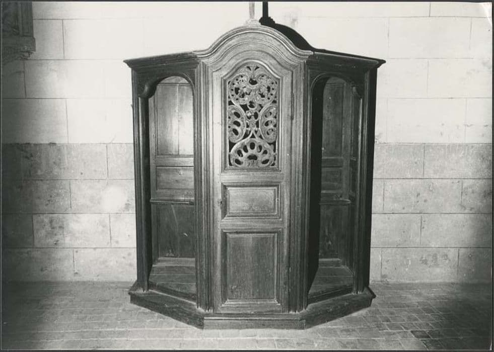 La partie supérieure de la porte du confessionnal est moulurée. Le panneau ajouré est orné de motifs floraux et de "coquillages" de style proche de la porte du confessionnal de Courtomer (PM77004553).