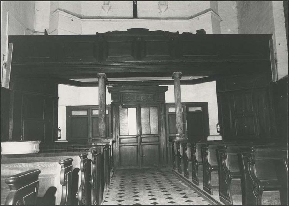 lambris de demi-revêtement ; tambour de porte ; tribune ; banc d'oeuvre