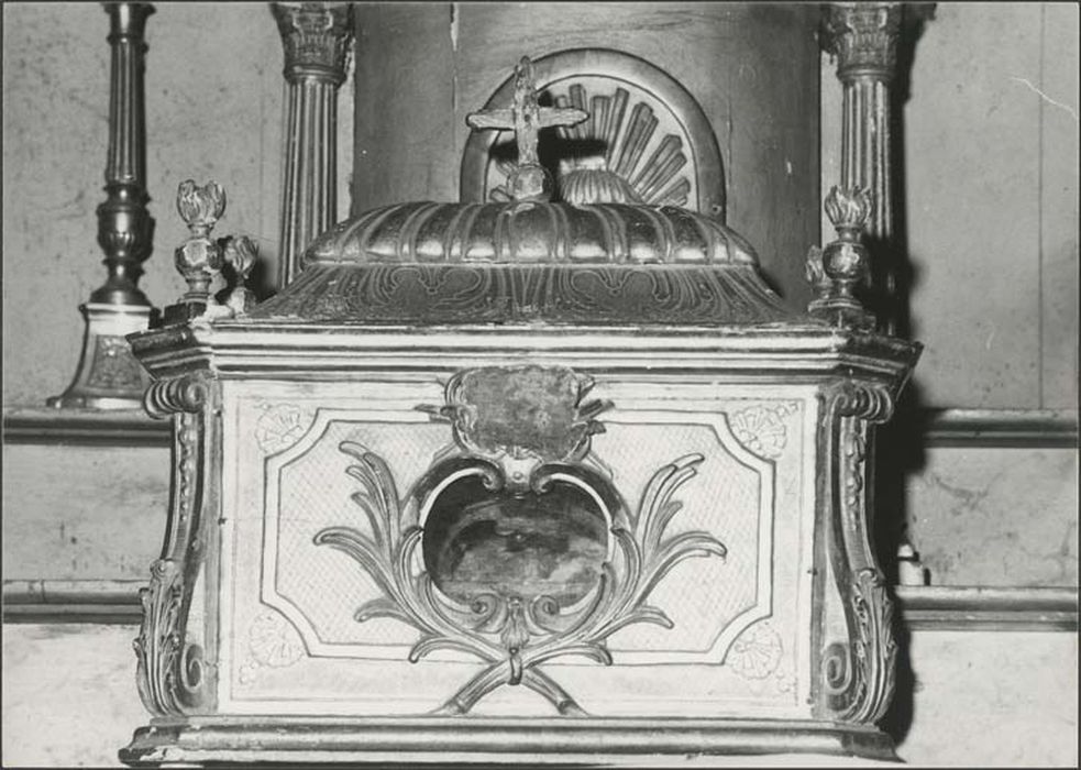 Reliquaire en forme de coffre orné de volutes aux angles, de palmes encadrant la petite lucarne qui permet de voir les reliques, et surmonté d'une petite croix.