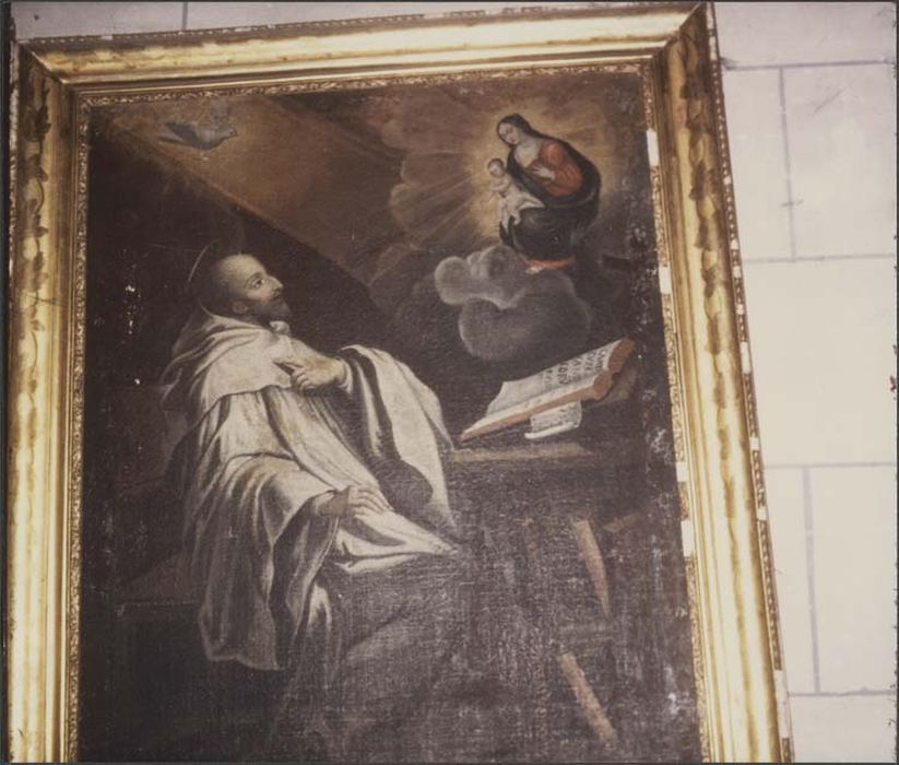 Ce tableau fut réalisé d'après une gravure de Jean Morin (Paris, 1605-1650, élève de Philippe de Champaigne), elle-même réalisée d'après un original aujourd'hui disparu de Philippe de Champaigne "Saint Bernard priant" de 1648, conservé avant la date de 1711 à Port-Royal des Champs. Une copie de la première moitié du 19e siècle a été exécutée d'après cette gravure par François-Vincent Latil pour l'église de Saint-Etienne-du-Mont (Paris) où elle se trouve encore actuellement. Cette "Apparition de la Vierge à saint Bernard" a-t-elle été réalisée par ce même Latil (1796 ou 99 - 1890) ? Ce tableau, s'il reprend exactement le motif et l'attitude du saint, la table d'écriture avec les livres en rayons et les faisceaux lumineux provenant d'une nuée, en diffère pourtant en partie haute par la représentation de la Vierge à l'Enfant et de la Colombe dans un rai de lumière. La Vierge semble pour sa part inspirée de la "Vision de saint Bernard" de Vicente Carducho (dit aussi Vincenzo Carducci ou Carduccio, 1576 ou 78 - 1638) réalisée en 1634 et conservée au Musée de Santa Cruz à Tolède (Espagne). L'attitude et la figuration de la Vierge sont similaires, ainsi que la gloire rayonnante et la nuée qui l'entourent (excepté l'absence de putti dans la version du 19e siècle).