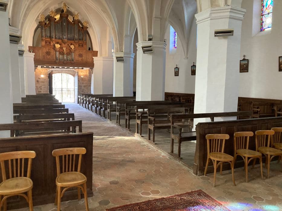 L'ensemble des bancs forme un tout homogène. Les bancs sont fixés sur un plancher en bois. Les bancs de la nef (vingt-huit) sont plus longs que ceux des bas-côtés (dix-neuf côté nord, dix-sept côté sud). Chaque banc est de plan rectangulaire, d'élévation droite, et repose sur quatre pieds, ceux de devant sont tournés, ceux de l'arrière sont de base carrée et se prolongent en tant que montants du dorsal. Le dorsal est composé d'une simple traverse haute, formant au revers un étroit pupitre. Les accoudoirs sont à angle droit, le montant est de forme balustre en bois tourné.