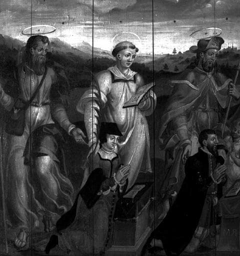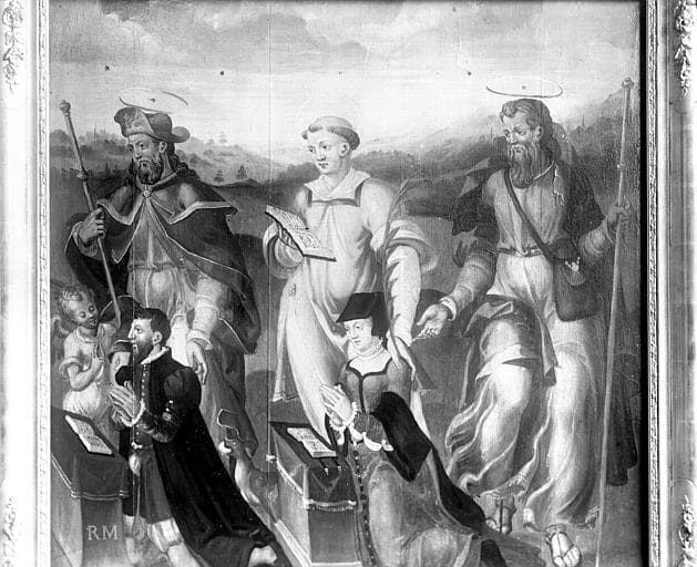 tableau : Donateur et donatrice accompagnés de leurs saints patrons, saint Roch, saint Etienne et saint Jacques