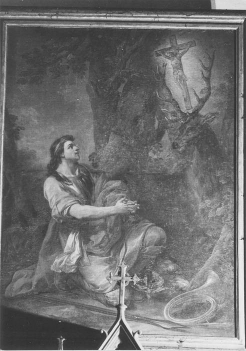 saint Hubert : agenouillé, vision : Christ en croix, cerf