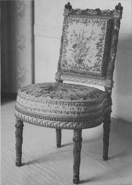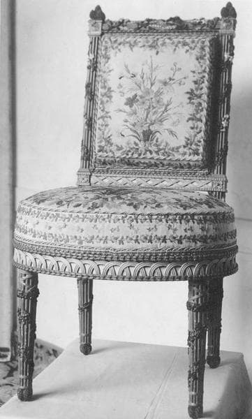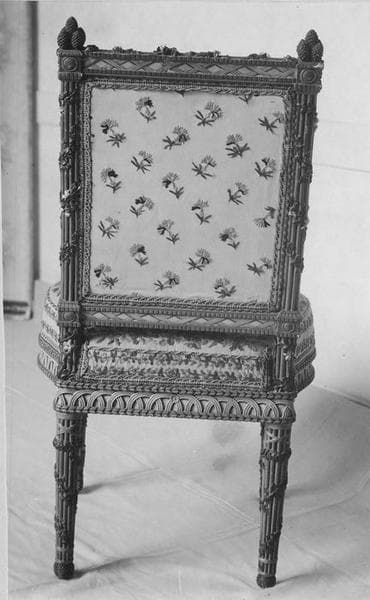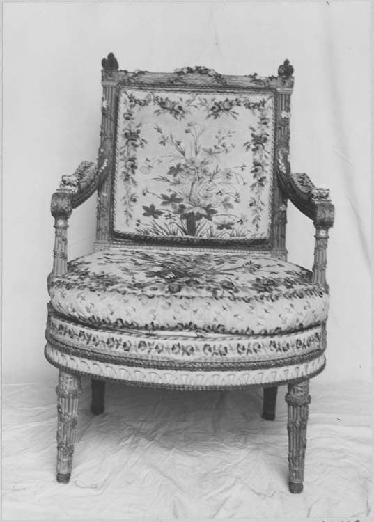Mobilier comprenant 2 chaises de forme rectangulaire, 2 fauteuils de forme rectangulaire, 1 tabouret de pied en bois peint d'osier, orné de fleurs, de rubans et d'attributs champêtres sculptés et peints au naturel recouverts de basin blanc brodé en laine de fleurs des champs, 1 écran orné à la traverse supérieure d'une houlette et d'un thyrse lié par des rubans, des couronnes de fleurs, du lierre et des jasmins, au bas des montants, 2 masques humains au naturel.