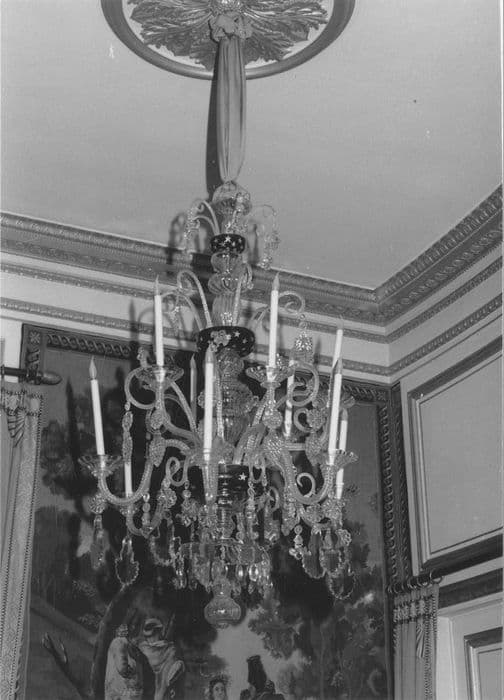 Lustre en cristal avec balustre central supportant deux couronnes de bras de lumière ornées e cristreaux taillés en gouttes et en fleurs de lys ; le balustre terminé par une boule en pendentif est orné de quatre coupelles en verre bleu marine étoilé.