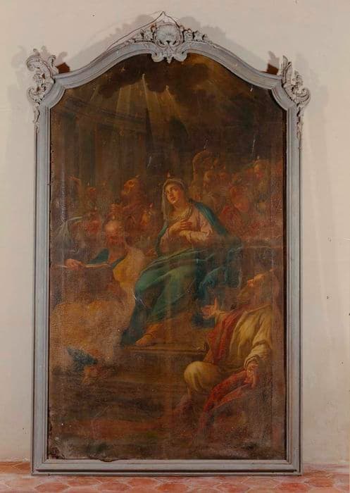 Dans ce tableau, représentant 'la Pentecôte', l'artiste se réfère au passage des Actes des Apôtres (1. 14) qui privilégie la présence de la Vierge ; il y est dit que les apôtres réunis à Jérusalem dans la chambre haute, c'est-à-dire dans la pièce principale de la maison, 'persévéraient dans la prière avec Marie, mère de Jésus'. Assise sur un trône, elle symbolise l'Eglise. Les apôtres, dans des attitudes très diverses, sont réunis autour d'elle. Au dessus de leurs têtes plane le Saint-Esprit sous la forme de langues de feu. L'Inspiration Divine est symbolisée par une pluie de langues de feu. Au premier plan, un apôtre est représenté, un genou à terre, les bras écartés, la tête levée vers l'apparition. d'autres sont penchés sur le Livre ouvert.