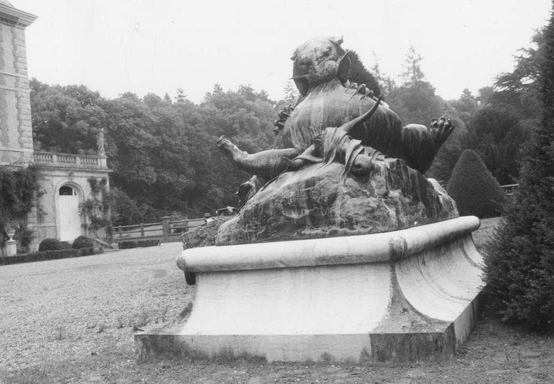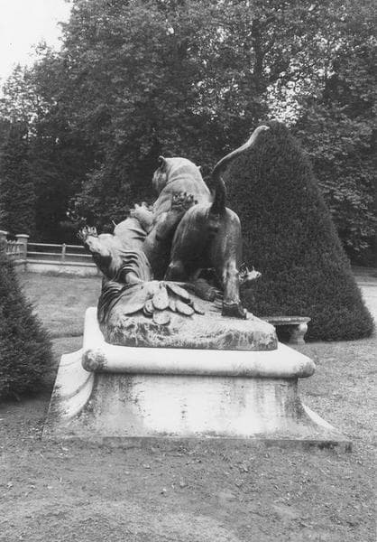 groupe sculpté : Combat de deux lionnes pour une tête de buffle