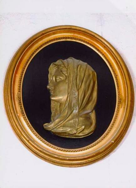 Médaillon ovale dans un cadre en bois doré, représentant la Vierge, de profil, en bronze doré, se détachant sur un fond de marbre noir.