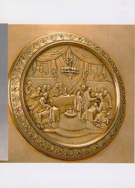 Calice et sa patène, burettes et leur bassin, clochette d'autel en argent doré. La patène figure la Cène.