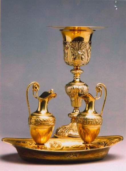 calice ; patène ; burettes (2) ; bassin ; clochette d'autel