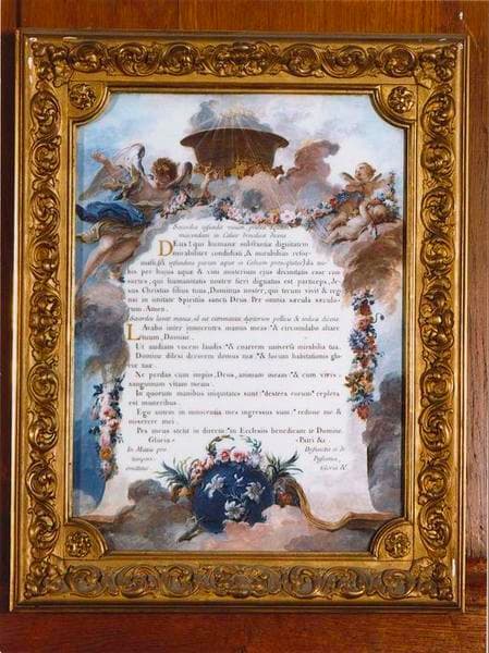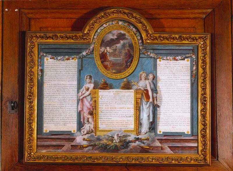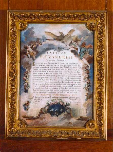 Le canon de gauche transcrit le texte de l'Evangile selon saint Jean. Le canon central, divisé en trois parties présente la prière de la consécration (à gauche), la Foi et l'Espérance (à droite), un médaillon figurant la Cène (au-dessus). Le canon de droite représente la mer d'Airain, servant aux purifications, supportée par des boeufs.