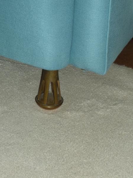 Pieds du canapé en métal, en forme d'entonnoir. Tissu bleu.