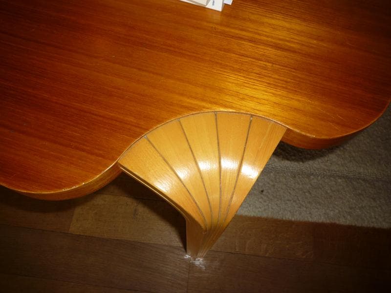 Ces quatre tables sont en frêne et teck. Seule la n° MC.A.239 est uniquement en frêne. Les pieds de ces quatre tables sont en X ou en éventail. Le pied en X fut conçu à partir de cinq pieds en L imbriqués.