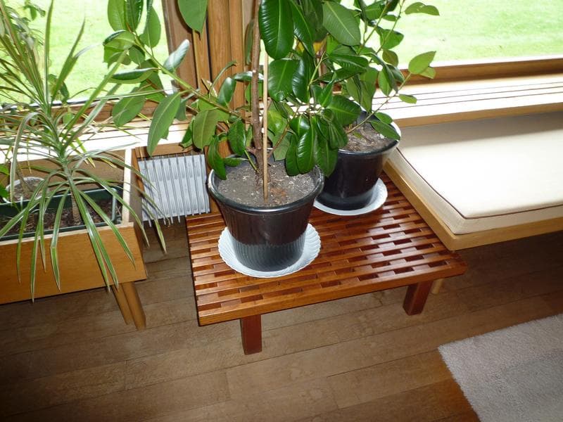 Cette table basse pour poser les pots de fleurs s'adapte aux piliers.
