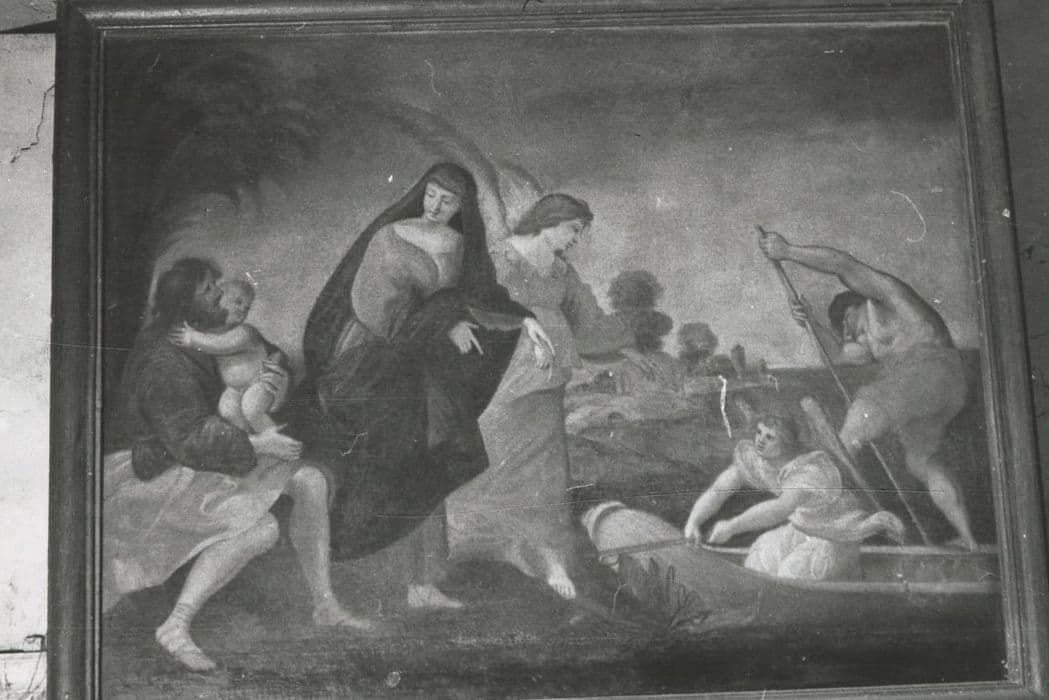 Sur la gauche, saint Joseph est assis et tient l'Enfant Jésus dans ses bras, tandis que la Vierge s'apprête à monter dans une barque, guidée par un ange.