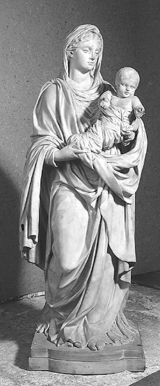 Statue mentionnée dans l'inventaire de 1906. Elle est très inspirée de la sculpture de la Renaissance italienne. Mais le visage poupin de l'Enfant Jésus, ainsi que la forme du socle, permettent de l'attribuer à la première moitié du 19e siècle.