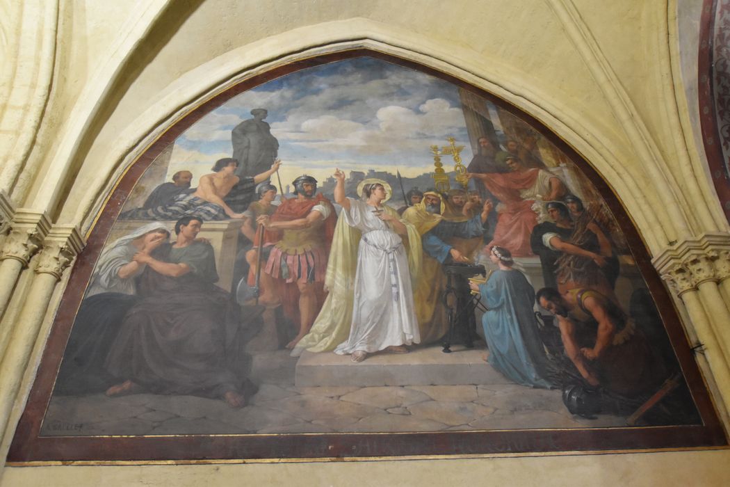 La commande faite à François Grellet répond au souhait de l'abbé Lefèvre, exprimé dans son testament, de faire réaliser une peinture murale montrant : un tribunal jugeant et condamnant sainte Honorine à être brûlée. La composition du peintre reprend ce thème en montrant l'épisode légendaire où la sainte, refusant de brûler l'encens pour une idole, est condamnée à mort par le proconsul romain.