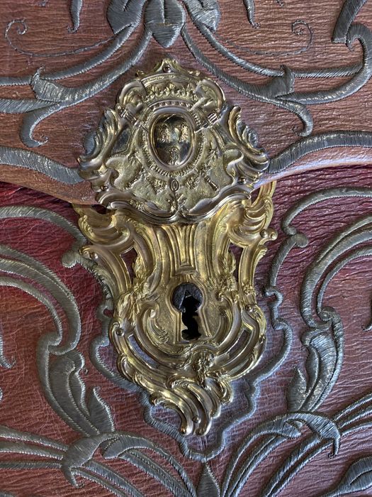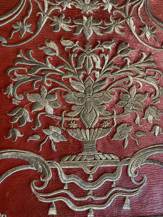 Maroquin rouge, fils d'argent, bronze doré.