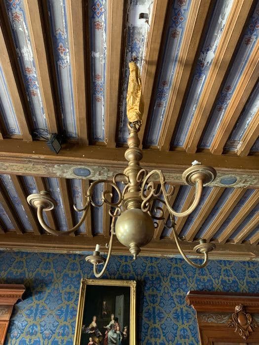 Lustre de la salle à manger, à quatre bras avec tête de dauphin, en laiton poli avec technique de dinanderie.