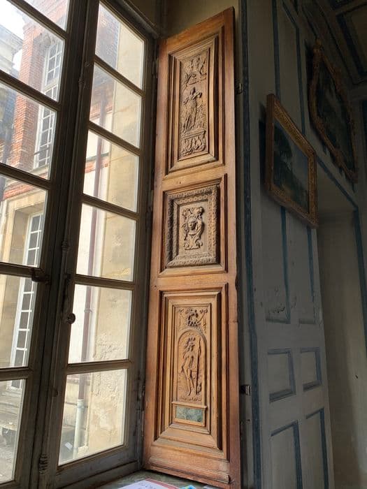 Fragments remontés dans deux volets intérieurs de la fenêtre sud-est de la cage de l'escalier d'honneur. Bois et marbre.