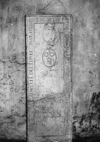 transcription : CY GIST DAME MARIE TURPIN VEFVE DE FEU LOYS CHASTAIGNIER ESCUYER SIEUR DE ROUVRE LAQUELLE DECEDA LE 6 MAY 1583. REQUIESEAT IN PACE ; transcription : .... TOR CHASTEIGNIER, COMMENDATOR S.REMIGI MATRI KARISSIMOE M.H.M.P.D.S.