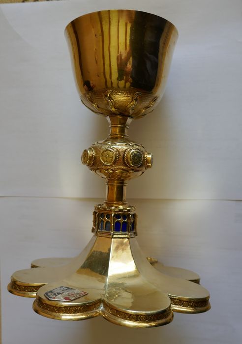 Pied à 8 lobes.£Calice doré au mercure ; sur le fond de la coupe a été rapporté et soudé un décor fondu ou repoussé autour duquel le fond a été maté au traçoir ; tige partiellement fondue et ciselée ; noeud fait de deux coquilles assemblées à la ceinture et maté à la bouterolle ; pied repoussé au marteau et décor rapporté fondu