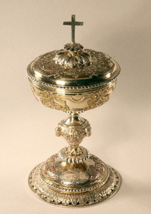 poinçon de maître : F et I surmontées chacune d'un grain de remède et situées de part et d'autre d'une hermine couronnée en chef ; lettre-date : couronne surmontant un V ; armoiries d'alliance accolées de Montauzier et de Chateaubriand, d'une part, d'Angenne et de Vivonne d'autre part