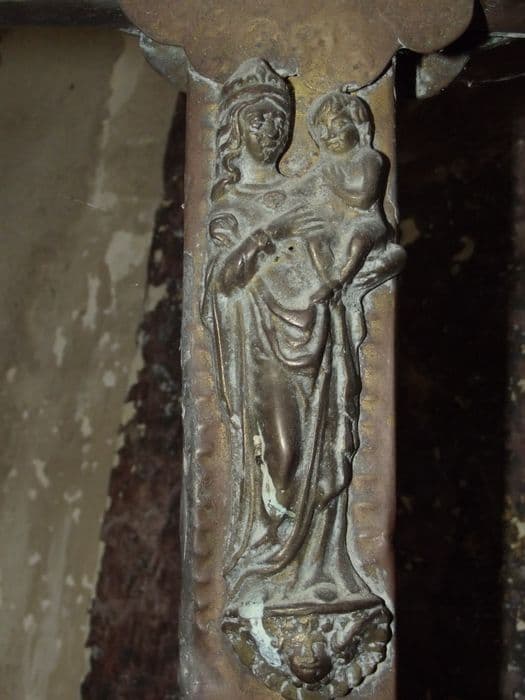 En forme de croix latine, cet objet présente en face, un Christ couronné et nimbé, les bras presque horizontaux, les pieds superposés et au-dessus un cartouche embouti avec l'inscription INRI. En extrêmités des branches de trouve une croix grecque pour en applique une fleur de lis. En revers, une Vierge couronnée portant l'Enfant sur le bras gauche sur la branche inférieure, en-dessous de la croisée des branches, dissimulée par une plaque circulaire échancrée de même surface que le nimbe de la face. Les extrêmités des branches comportent le même motif décoratif que sur la face. Entre la croix et la douille de la hampe, un noeud piriforme ciselé et surmonté d'une sorte de platine-bobèche festonnée.
