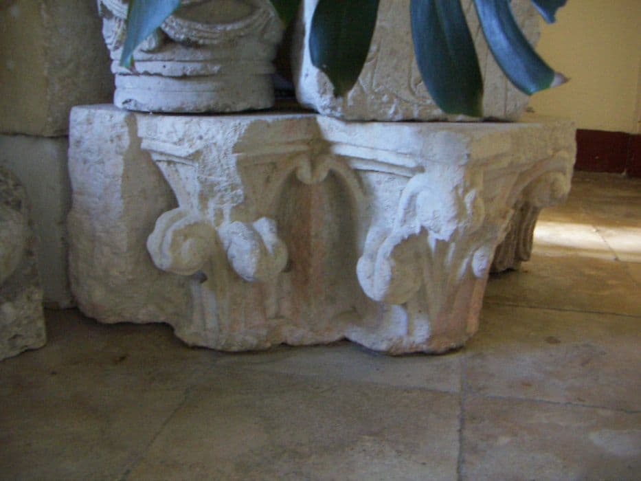 Chapiteau double à boules coiffées d'une feuille à trois lobes.