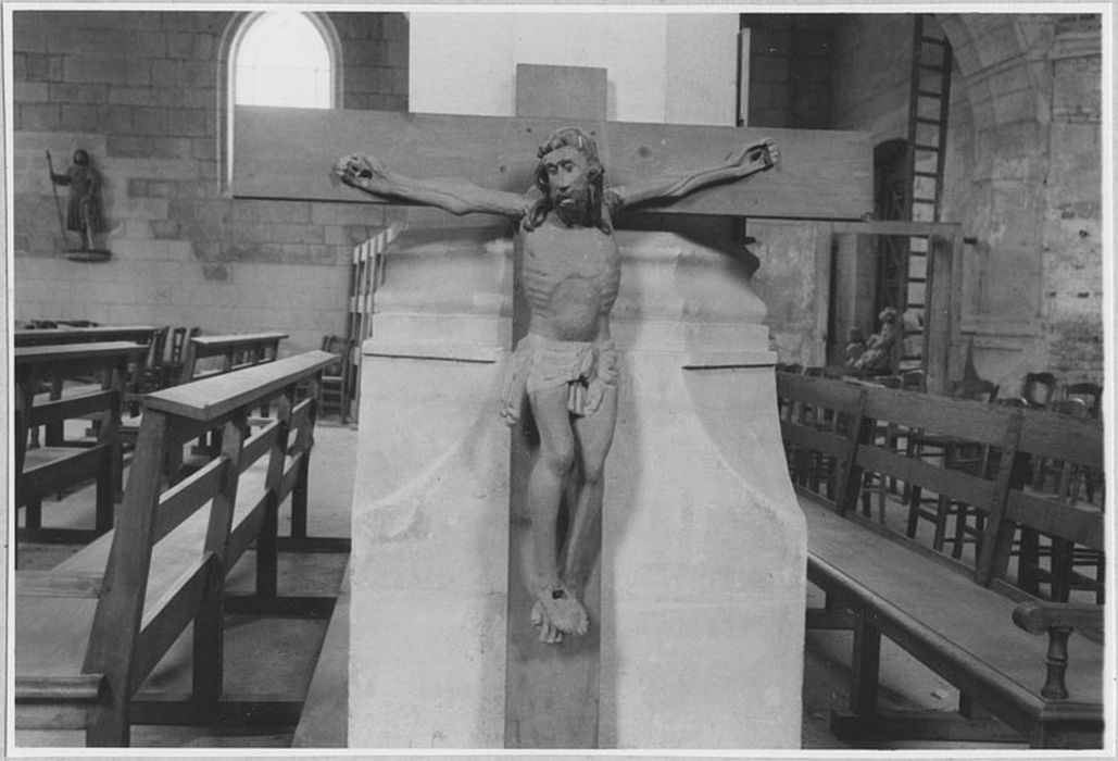 nef, contre le mur, à droite (Christ) ; choeur, à l'entrée, à droite et à gauche (Vierge et saint Jean)