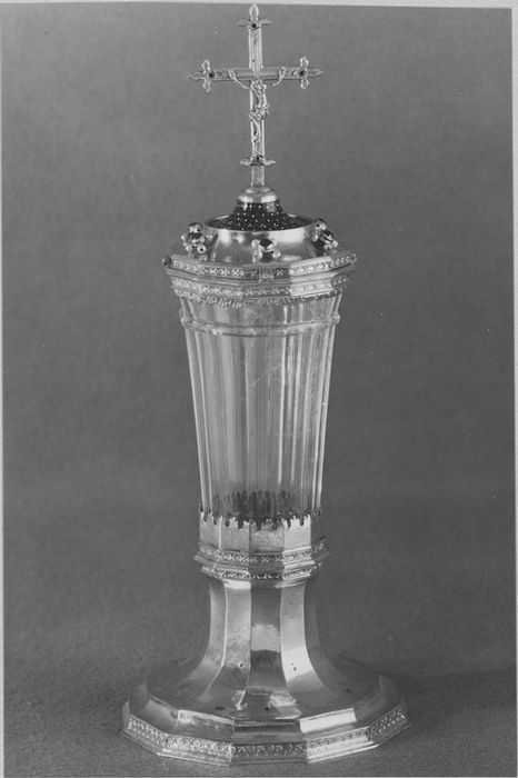 Gobelet de cristal à pans, monté sur un pied à pans, qui en constitue les profils en s'évasant, et muni d'un couvercle formé de deux gorges successives, que surmonte un crucifix. Une des gorges est ornée de rubis entre quatre perles, l'autre set émaillée de vert translucide à points rouges et blancs.