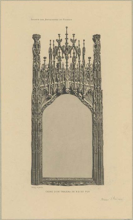 Ce panneau a été donné en 1618 par Philippe de Conti, licencié ès-lois, seigneur de Forestel, du Quesnoy-en-Santerre et d'Amery, capitaine des Arbalétriers d'Amiens, maître du Puy en 1525. Il se trouve depuis 1908 au musée d'Amiens, dans son cadre original.Ce panneau se trouve depuis 1908 au musée d'Amiens. A partir de la liste établie par P.F. Marcou, inspecteur des monuments historiques en charge des objets mobiliers en 1907, le procès-verbal de dépôt suivant est établi le 15 juillet 1911 : <I>Ministère de l'instruction publique et des BA - département de la Somme : Dépôt au musée de Picardie d'objets mobiliers (objets figurant à l'inventaire du mobilier légal), provenant de l'ancien palais épiscopal d'Amiens. Procès-verbal.Entre les soussignés Monsieur René Favry, architecte des Monuments historiques du département de la Somme, demeurant 7 impasse Joron à Amiens, représentant de l'Administration des BA et Monsieur Léon Delambre, conservateur du musée de Picardie demeurant rue Saint Geoffroy n°33 à Amiens représentant l'Administration municipale. Il a ét arrêté ce qui suit : En exécution du decret du 13 mars 1919, le service domanial a remis à l'Administration des BA aux termes d'un pv en date du 22 mai 1909 les objets mobiliers ci-après désignés existant dans l'Ancien Palais épiscopal d'Amiens :- huit pannneaux peints figurant la Glorification de la Vierge et provenant de la confrérie de N.D. du Puy à la cathédrale d'Amiens 1518, 1519, 1520, 1521, 1525, 1603, 1618 ; - Le Christ bénissant, panneau peint, 16e siècle ; - Diptyque : La Vierge à l'Enfant, la Vision de Saint-François d'Assise, donateurs, panneaux peints, commencement du XVIIe siècle. Ces dix pièces appartenant à l'Etat, comme provenant de la Cathédrale d'Amiens et classées par arrêté du 6 juin 1902, ont été à titre de mesure conservatoire transférées au musée de Picardie suivant pv du 19 décembre 1906. En vertu d'une décision prise par M. le Ministre de Instruction Publique et des Beaux-Arts à la suite d'un accord intervenu avec la Ville d'Amiens, ces objets doivent être placés à titre de dépôt au musée de Picardie. En conséquence M. R. Favry représentant à l'Administration des Beaux-Arts déclare remettre les objets ci-dessus détaillés à M. Delambre représentant l'Administration municipale es qualité qui les reçoit en dépôt et se charge à partir de ce jour d'en assurer la garde et la conservation. Fait à Amiens le 15 juillet 1911.</I>