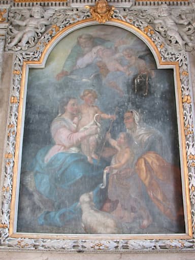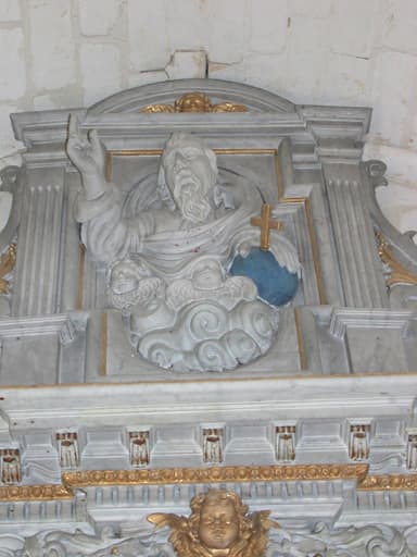 POP | Plateforme ouverte du patrimoineretable du maître-autel, tableau : La Sainte Famille, statues : Le Sauveur du Monde bénissant et tenant la boule terrestre, Vierge à l'Enfant jouant avec un oiseau éployé, Le Père Eternel, gradins d'autel, tabernacle (œuvre volée)
