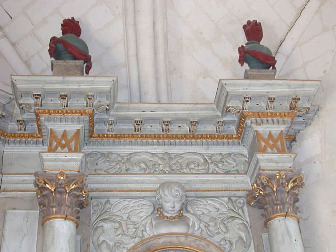 retable du maître-autel, tableau : La Sainte Famille, statues : Le Sauveur du Monde bénissant et tenant la boule terrestre, Vierge à l'Enfant jouant avec un oiseau éployé, Le Père Eternel, gradins d'autel, tabernacle (œuvre volée)