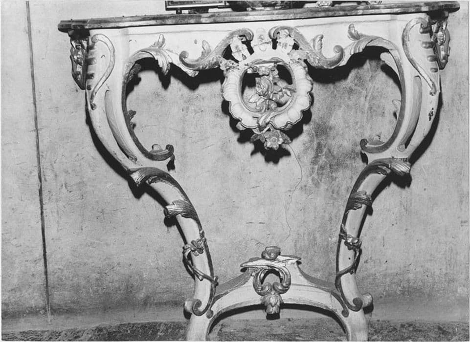 Crédences de style Louis XV, en bois peint blanc et or, avec dessus en marbre, l'une à décor d'objets liturgiques et de têtes d'anges, et l'autre à décor de fleurs.