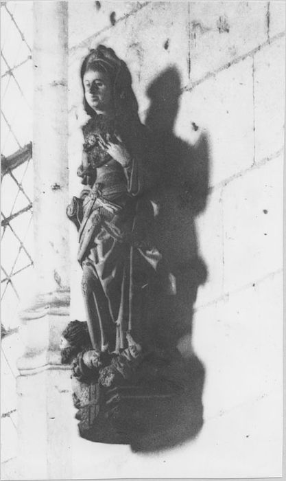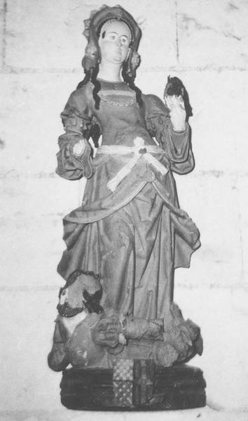 La sainte, debout, richement costumée, tient un livre d'une main (l'autre est brisée). Elle foule aux pieds son persécuteur. Elle est couverte d'un mauvais polychromage.