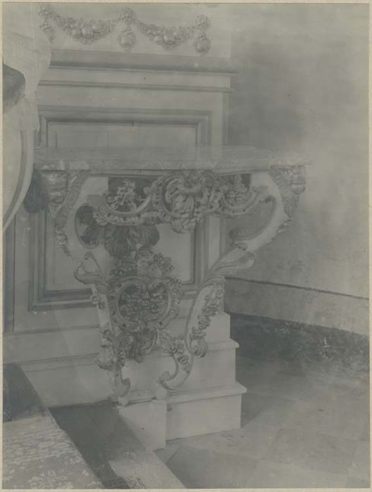 Consoles de style rococo en bois doré, à plateau de marbre, encadrant le maître-autel.