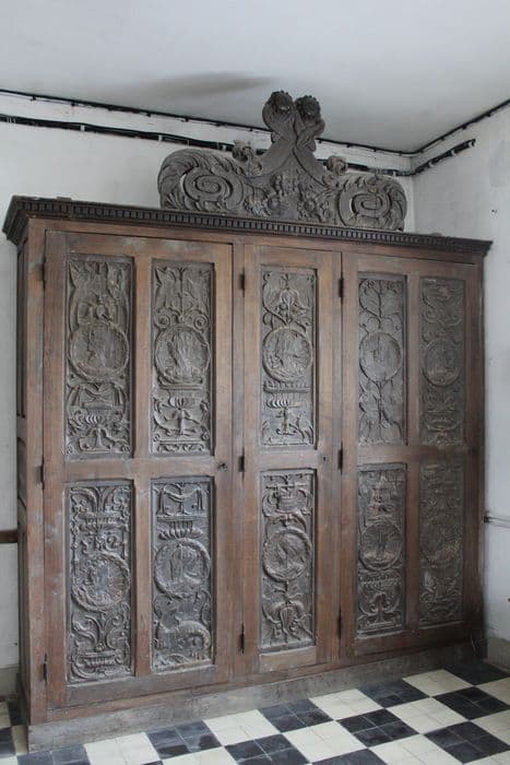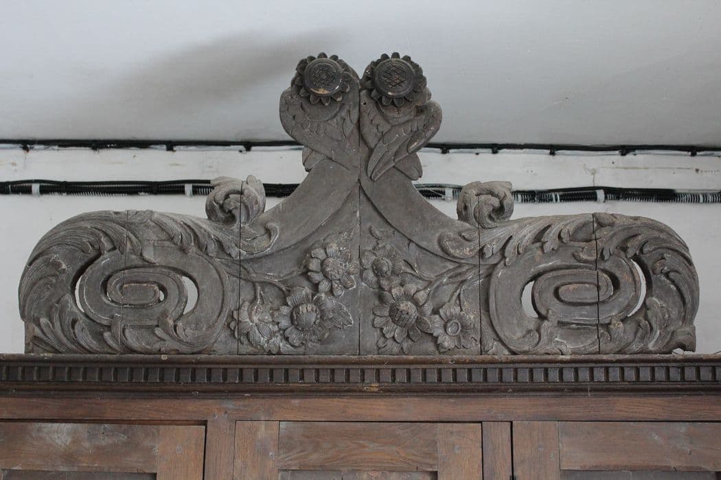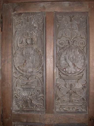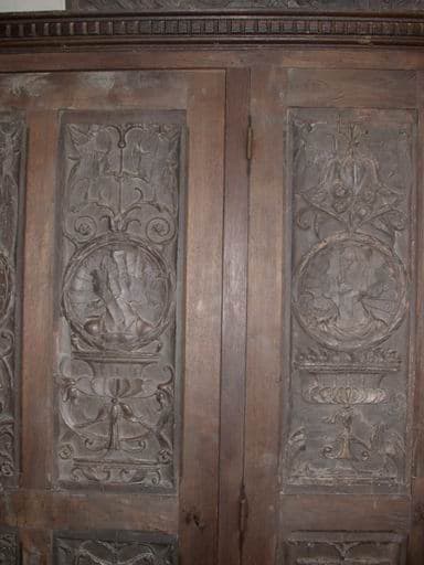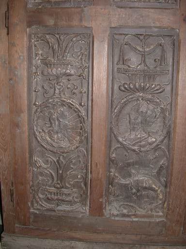 L'ensemble consiste en des panneaux de l'ancienne tribune des orgues, remontés dans un meuble de sacristie.