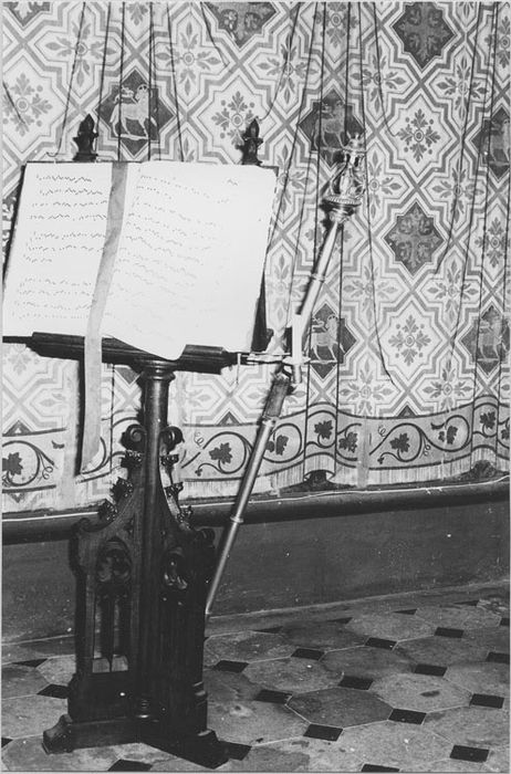 Lutrin néo-gothique en bois sculpté, accosté de deux bâtons de chantre en cuivre argenté avec au sommet des statuettes de la Vierge et d'un évêque.