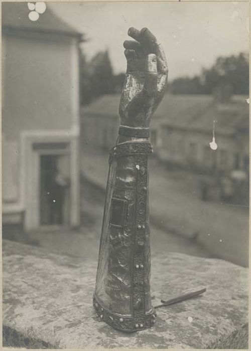 Bras-reliquaire en argent estampé sur âme de bois. Les parements sont en cuivre doré, et sont décorés de pierres, cabochons, pâtes de verre, ivoire, turquoises, agates, et de quelques pierres fines plus récentes. Le galon qui borde la couture de la manche antérieurement et le dessous du bras sont gravés. Sur un des côtés, une montre quadrangulaire laisse voir la relique.