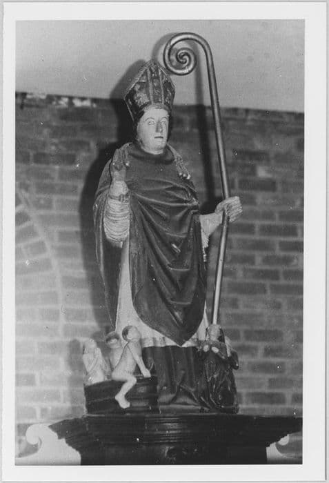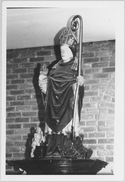 groupe sculpté : Saint Nicolas avec donateurs et les enfants dans un baquet