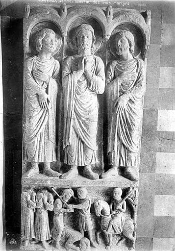 Sur un socle, six faisceaux de quatre colonnettes portent une dalle épaisse dont la tranche est ornée de rinceaux et dont le dessus porte les statues des trois saints sous des arcs en plein cintre. Au-dessous est représentée la scène de leur martyr.