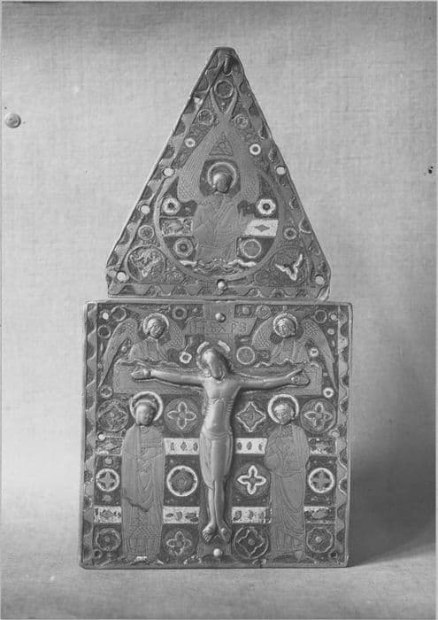 Pignon de châsse en cuivre autrefois doré et émaillé.