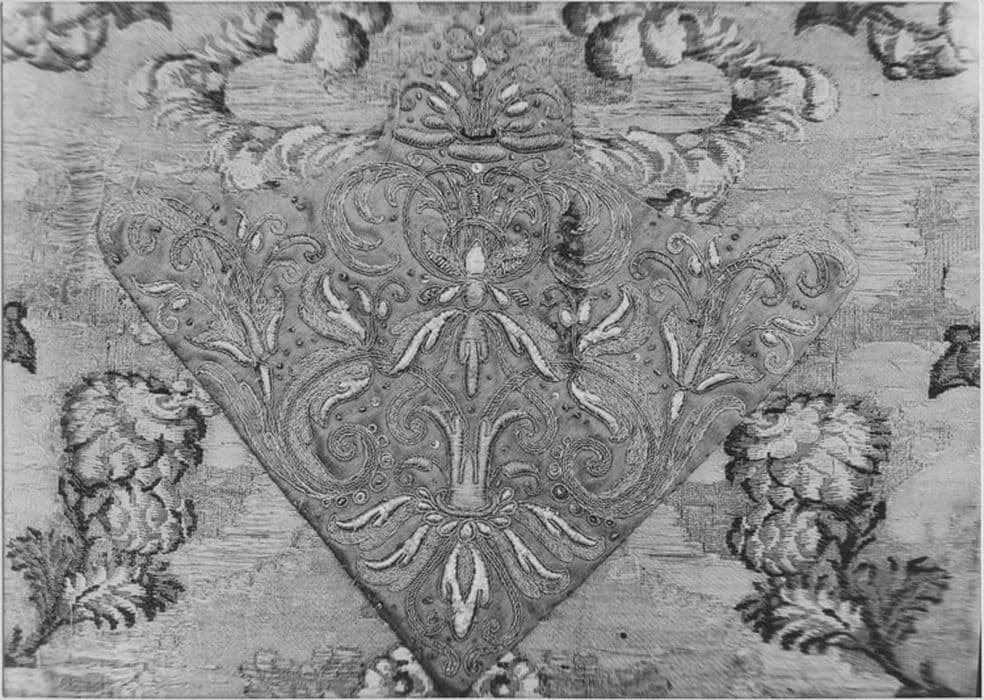 soie : brodé ; fil métal : doré, argenté ; matériau textile : broché