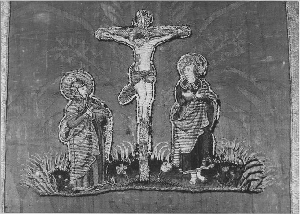 Bourse de corporal représentant la Crucifixion. Montage sur un tissu moderne.